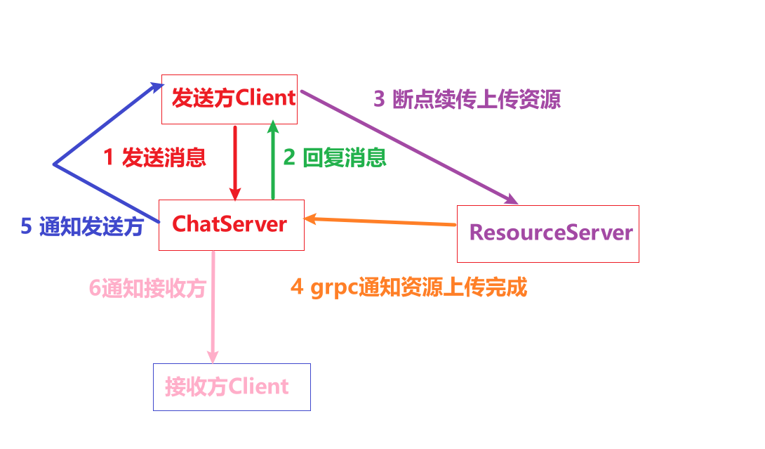ChatServer的回复后,将资源断点续传方式传输给ResourceServer `ResourceServer需要采用断点上传方式回复给客户端。ResourceServer将接收完整资源后,需要通过grpc将消息发送给ChatServer更新消息为已经上传完成的状态。ChatServer收到消息后更新数据,并且做消息推送,推送给消息关联的双方。推送给发送方资源已经上传完成。推送给接收方资源已经上传完成- 发送方将图片设置为已上传状态,接收方则展示预览图,并显示进度百分比。